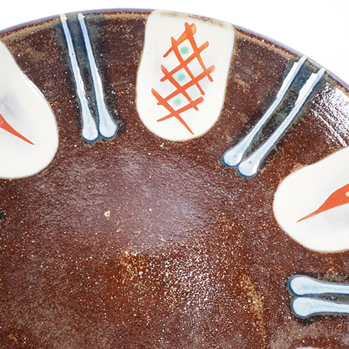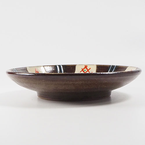 赤土を丁寧に焼くことで生まれる、茶や赤、黒が混ざりあった深い色味に、やちむんならではの模様が描かれたお皿。
