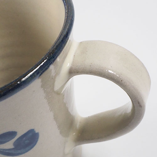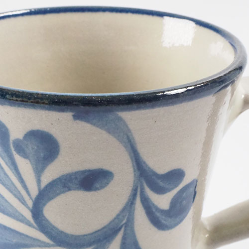 コバルトブルーの唐草模様がすっきりとした印象のマグカップ。