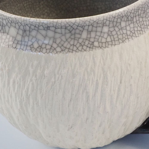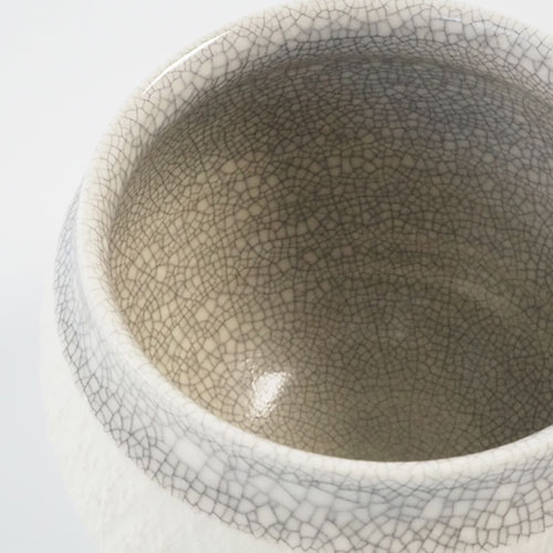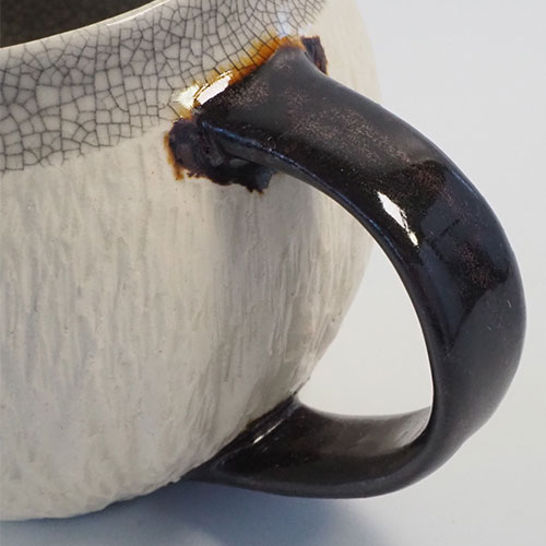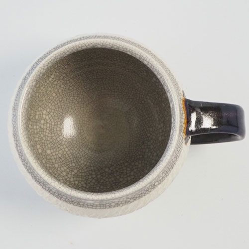 鹿児島県で薩摩焼の技法を用いながら、新しいデザイン性のある作品を作られています。 白薩摩の微細な貫入に天然顔料を染めたシリーズのマグカップ。ぽってりとした丸い形があたたかみのある丸まぐです。 外面の浸食された大地のような肌感部分は、飛鉋で深く掘り込んで作られています。