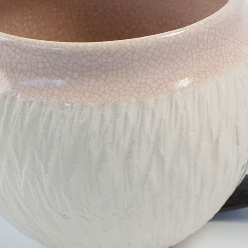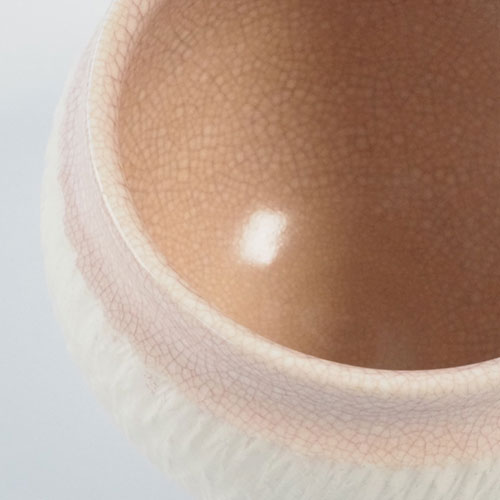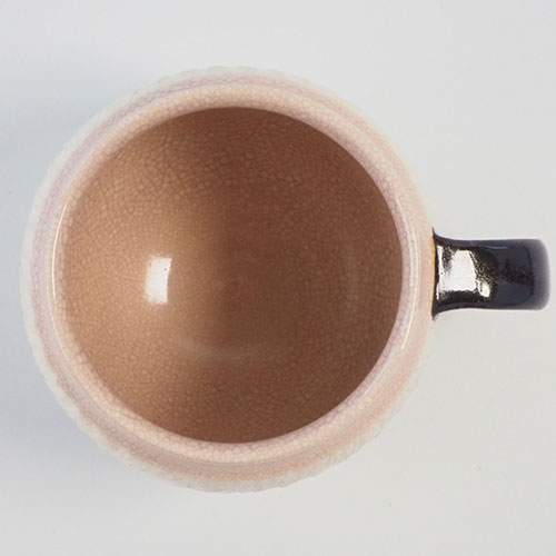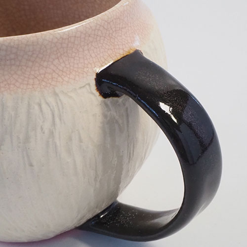 鹿児島県で薩摩焼の技法を用いながら、新しいデザイン性のある作品を作られています。 白薩摩の微細な貫入に天然顔料を染めたシリーズのマグカップ。ぽってりとした丸い形があたたかみのある丸まぐです。 外面の浸食された大地のような肌感部分は、飛鉋で深く掘り込んで作られています。