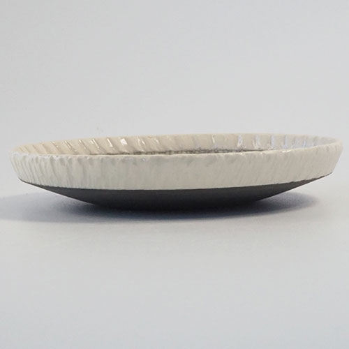 外面の浸食された大地のような肌感部分は、飛鉋で深く掘り込んで作られています。