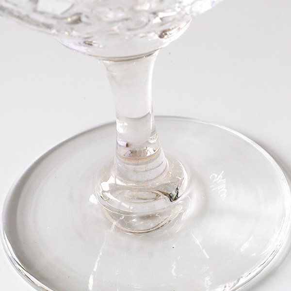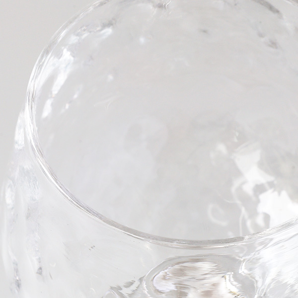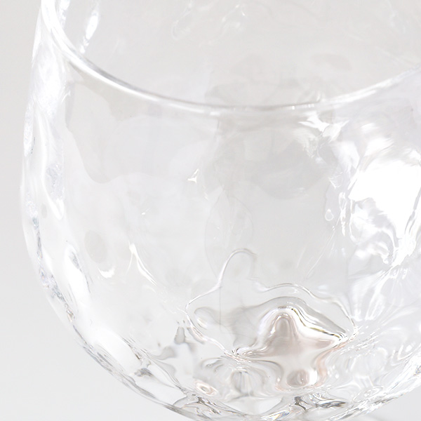 ガラスの凹凸によって印影がうまれるワイングラス。飲み物をそそぐと、光をうけて美しくゆらぎます。ワイングラスの脚部分(ステム)が短く小ぶりなため、日常使いしやすいサイズ感です。