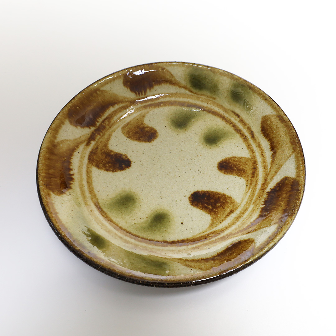 土っぽさを残した素朴な味わいの器に大胆ながらも柔らかみのある模様を施しています。